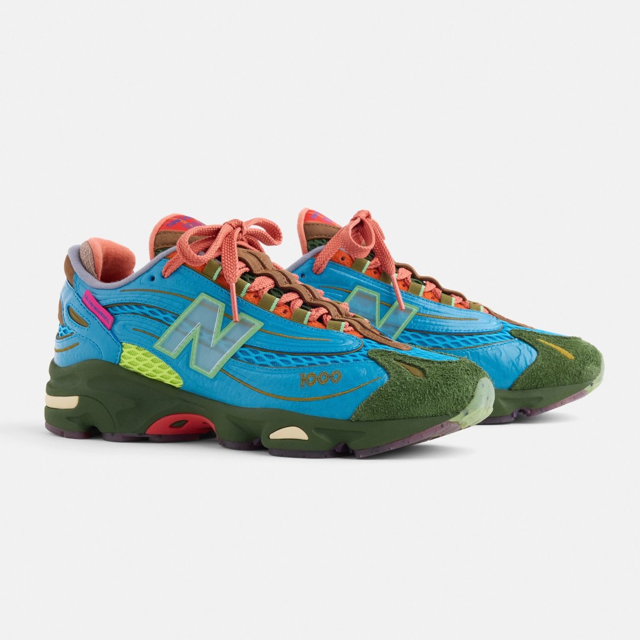 E foi inspirado por essa aura mística, colorida e cheia de texturas que Bembury trouxe elementos relacionados para o New Balance 1000 intitulado ‘Fog be the cloud’. O modelo traz no cabedal as cores do pôr do sol local com o laranja/coral representando o céu, o azul fazendo a vez da névoa e o verde da vegetação. O tênis conta com a digital de Salehe como assinatura, tag gravada com seu nome na lateral e os logos padrão do New Balance 1000.