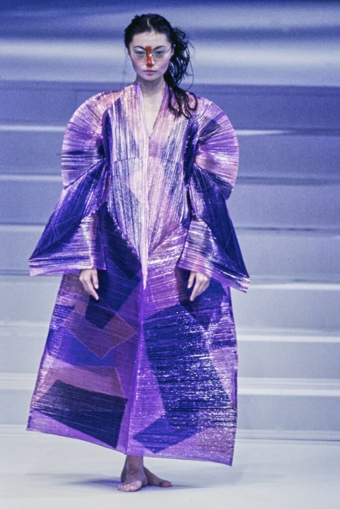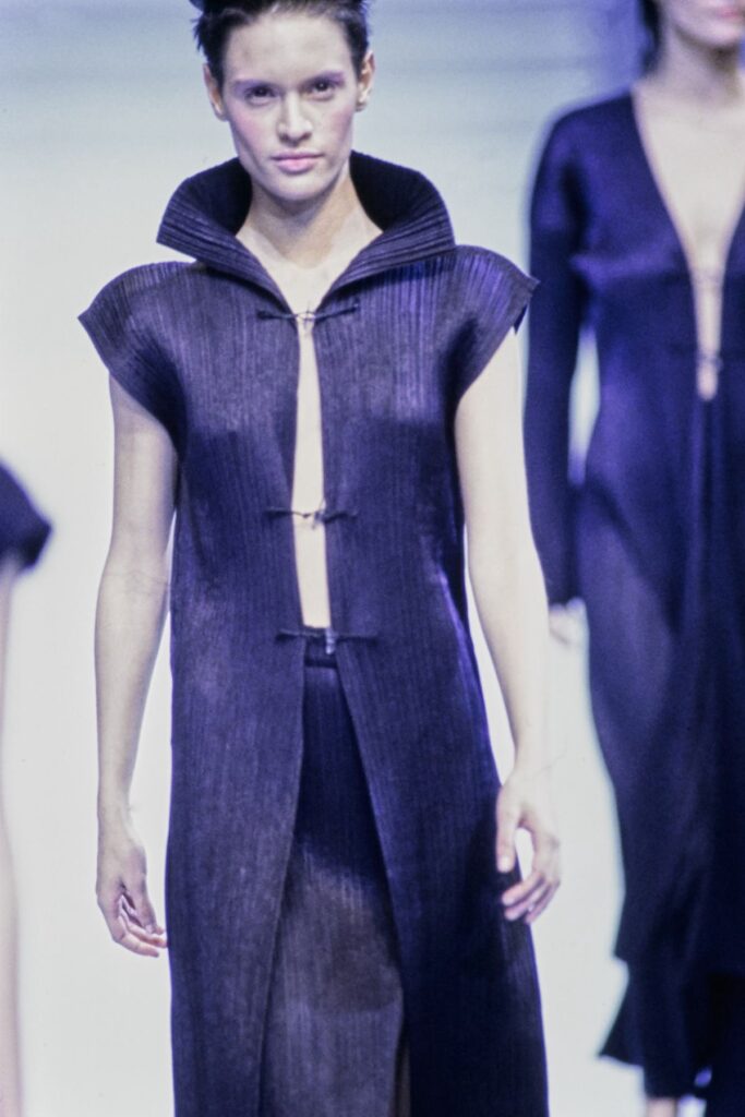O desenvolvimento dos plissados industriais, que mais tarde dariam origem ao Pleats Please, redefiniu o que entendemos como moda funcional. Peças leves, duráveis, pensadas para o uso real, sem abrir mão de conceito.