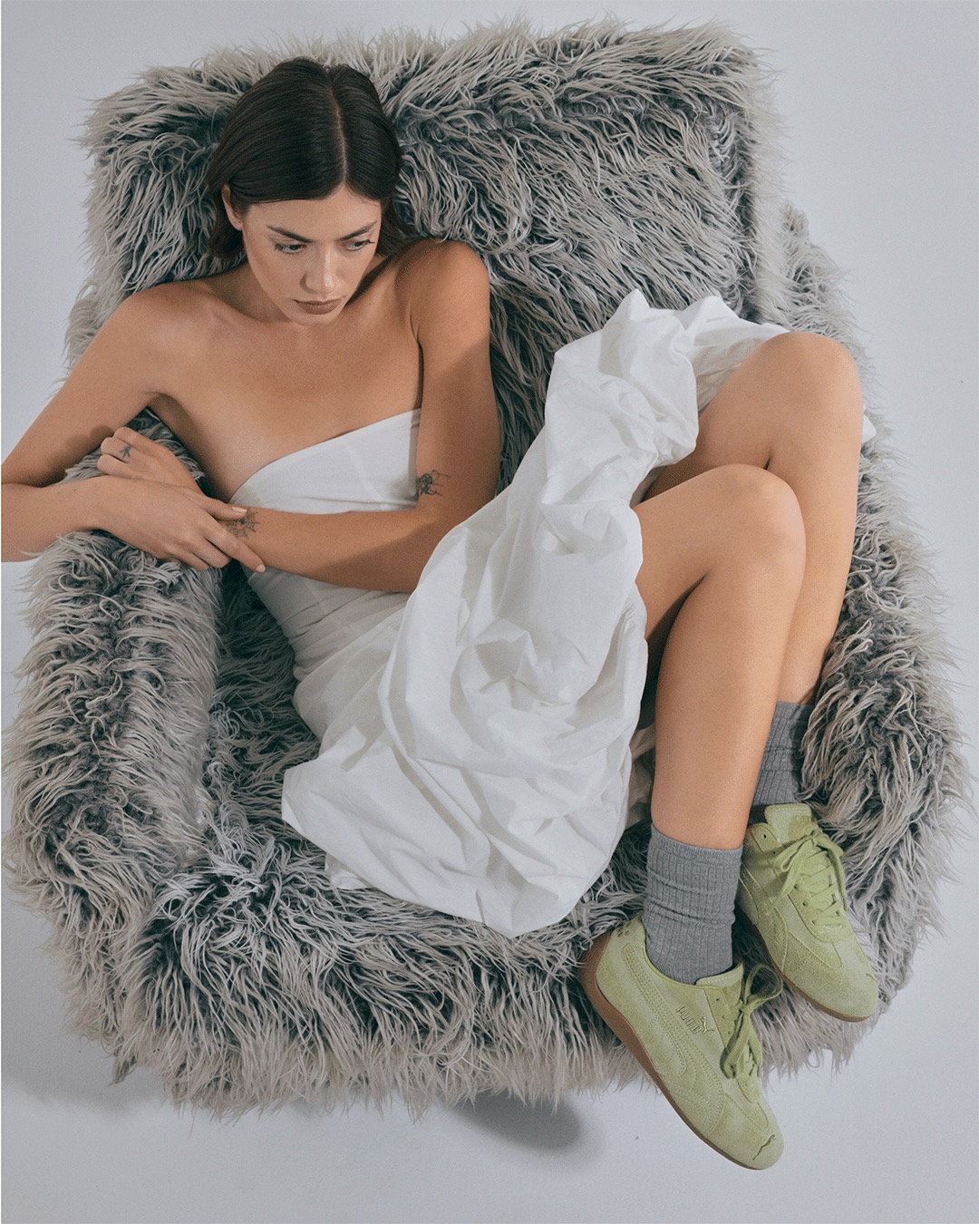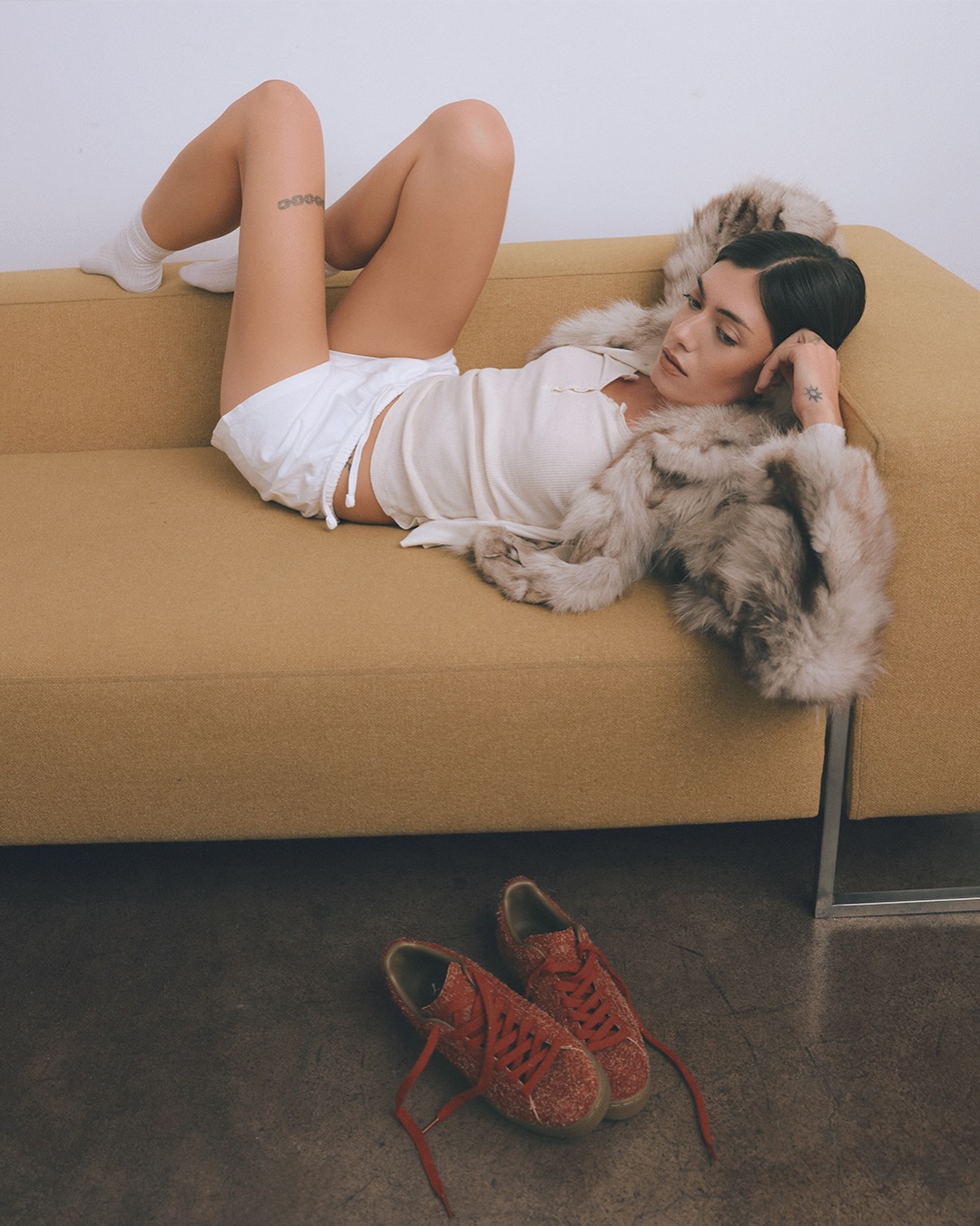 Na colaboração atual, Daniëlle escolhe o Suede e o Speedcat não pelo óbvio, mas pelo que cada modelo representa. O Suede Fuzzy “Mars Red” ganha um cabedal mais texturizado, quase felpudo, que altera a leitura do clássico sem descaracterizá-lo. A superfície passa a ter protagonismo, trazendo profundidade visual e uma sensação mais orgânica ao toque.