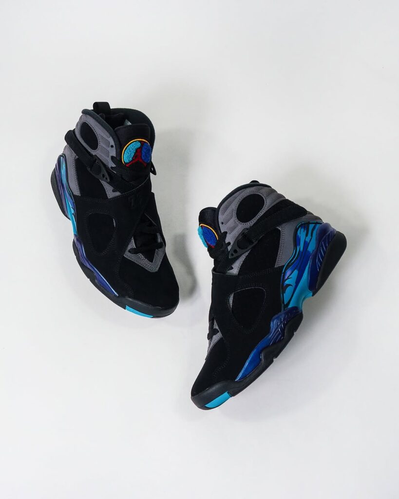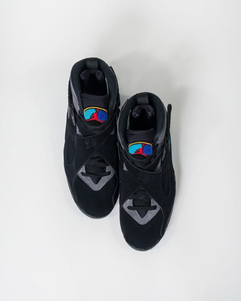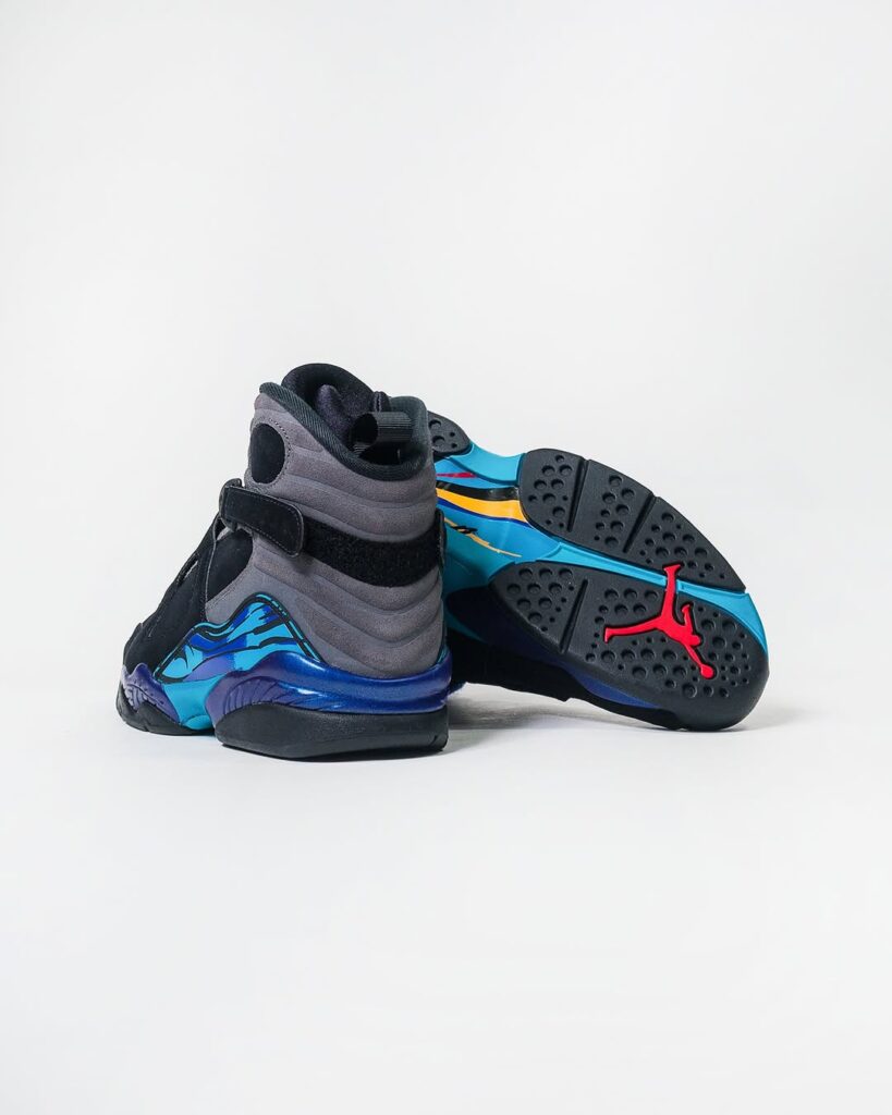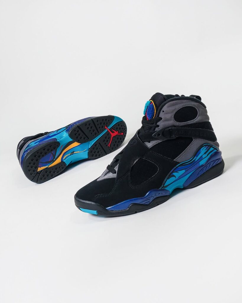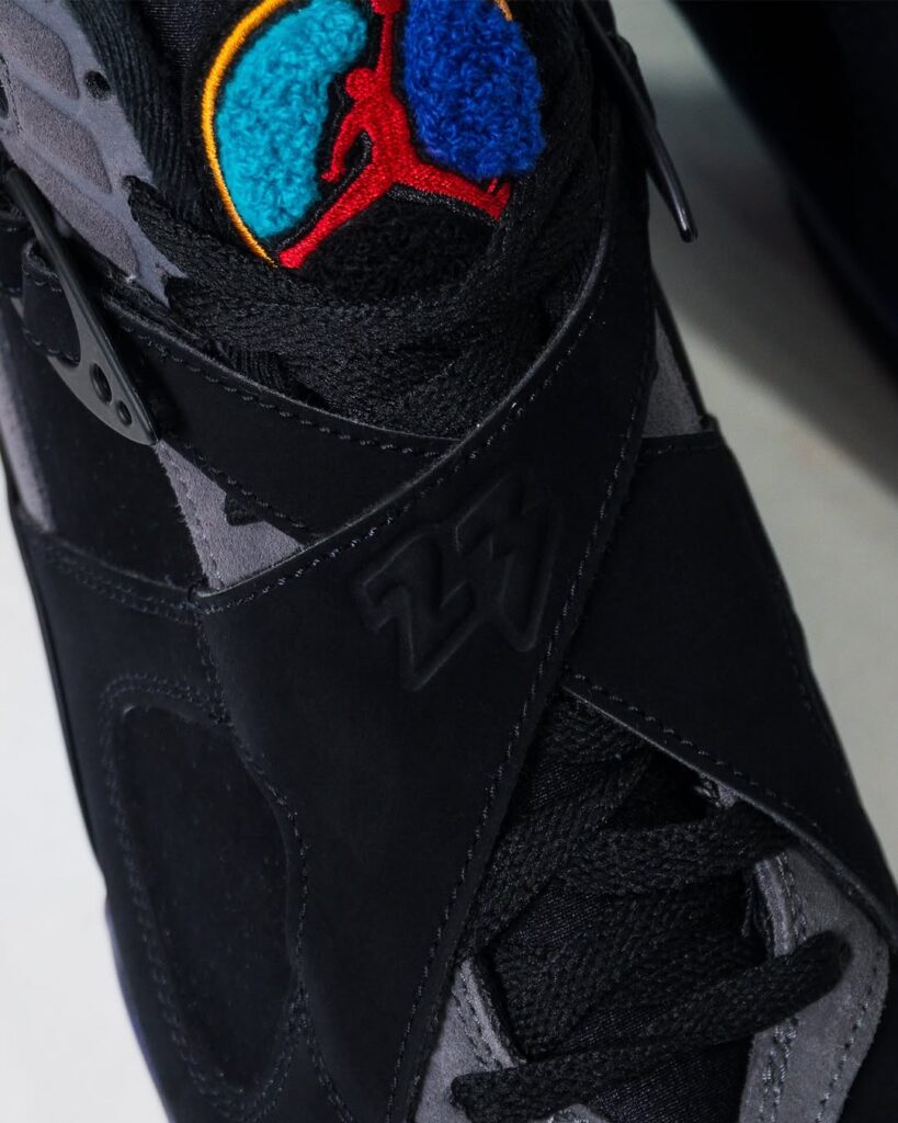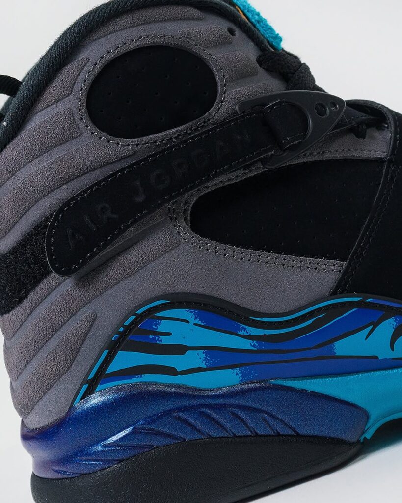 O cabedal em nubuck preto serve de base para os detalhes em Bright Concord e Aqua, cores vibrantes que lembram murais de rua e capas de discos dos anos 90. As tiras cruzadas não são só parte do design funcional, mas um detalhe que deixou o AJ8 com um visual único. Já o patch de chenille na língua traz aquele toque vintage, como as letras de jaquetas varsity, reforçando o lado esportivo e cultural do modelo.